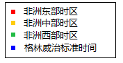 非洲大陆有4个主要时区,包括非洲东部时区(EAT, UTC +3),非洲中部时区(CAT, UTC +2),非洲西部时区(WAT, UTC +1)和格林威治标准时间。非洲各国没有夏令时。