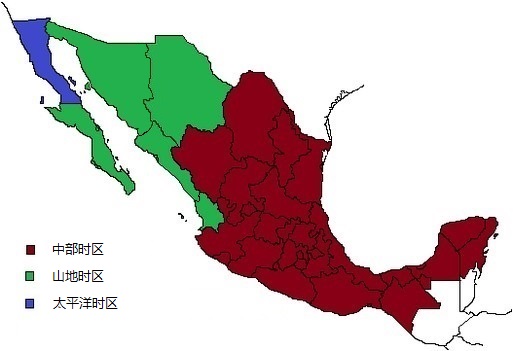 墨西哥有三个主要时区,包括中部时区, 山地时区和太平洋时区。 除了西北地区, 大部分墨西哥地区都位于中部时区内(