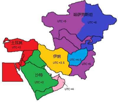 中东和中亚地区的时区主要有: UTC +6: 哈萨克斯坦东部,吉尔吉斯斯坦,塔吉克斯坦 UTC +5: 巴基斯坦,哈萨克斯坦西部(比如阿克陶市),乌兹别克斯坦,土库曼斯坦 UTC +4.5: 阿富汗 UTC +4: 阿联酋,阿曼 UTC +3: 沙特,也门,伊拉克,科威特,卡塔尔,巴林 UTC +2: 土耳其,叙利亚,黎巴嫩,约旦,以色列,巴勒斯坦,埃及